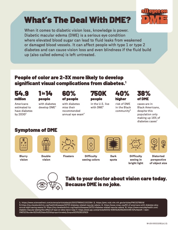 The All Eyes on DME campaign features firsthand accounts from Wayans alongside other individuals living with diabetes. On AllEyesonDME.com, people impacted by or at risk for DME can find information on symptoms, risk factors, and causes, as well as patient and caregiver tools to prepare for productive conversations with doctors.